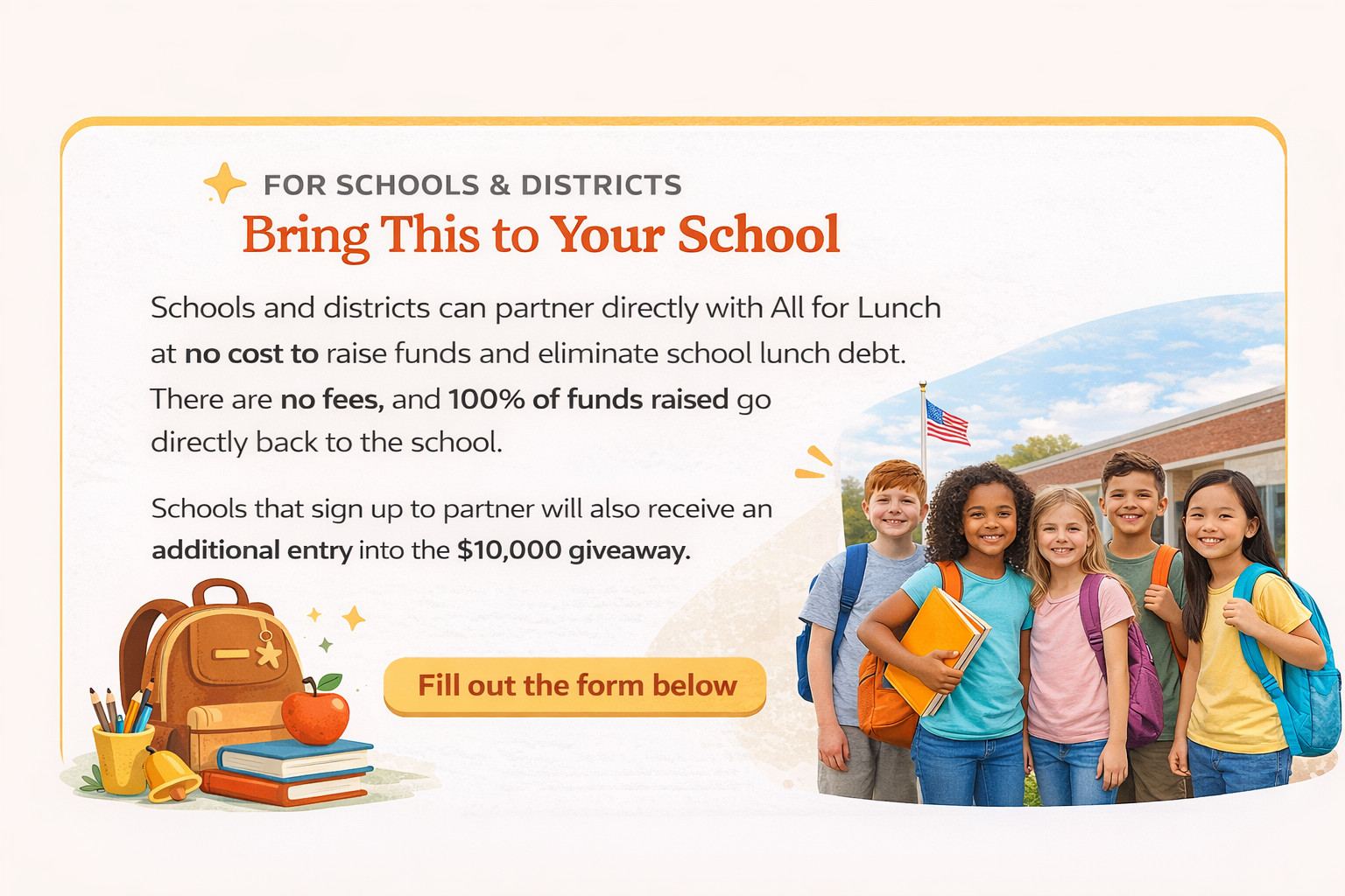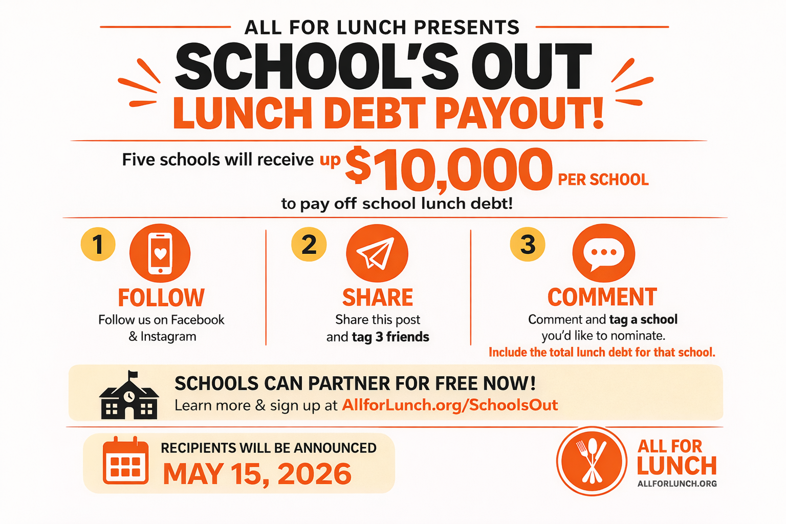 Through our School’s Out campaign, we are excited to partner with schools and communities nationwide. Five schools will be selected at random, and All for Lunch will pay off their entire school lunch debt, up to $10,000 per school. In addition to the giveaway, this campaign helps raise awareness and support for students everywhere.